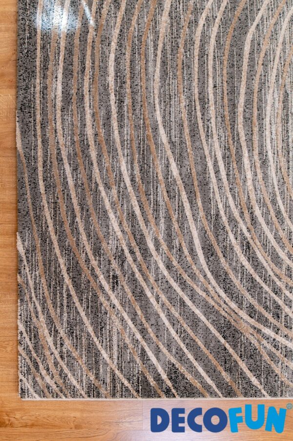 فرش ماشینی مدل Nora 6207 با طراحی مدرن زمینه طوسی و خطوط دایره ای کرم و قهوه ای، ترکیب رنگی جذاب و چشم نوازی دارد که به فضای اتاق حس شیک و مدرن می دهد. این رنگبندی به شکلی متوازن و هماهنگ به چشم می آید و در عین حال جزئیات خاصی را در طراحی فرش نمایان می کند.